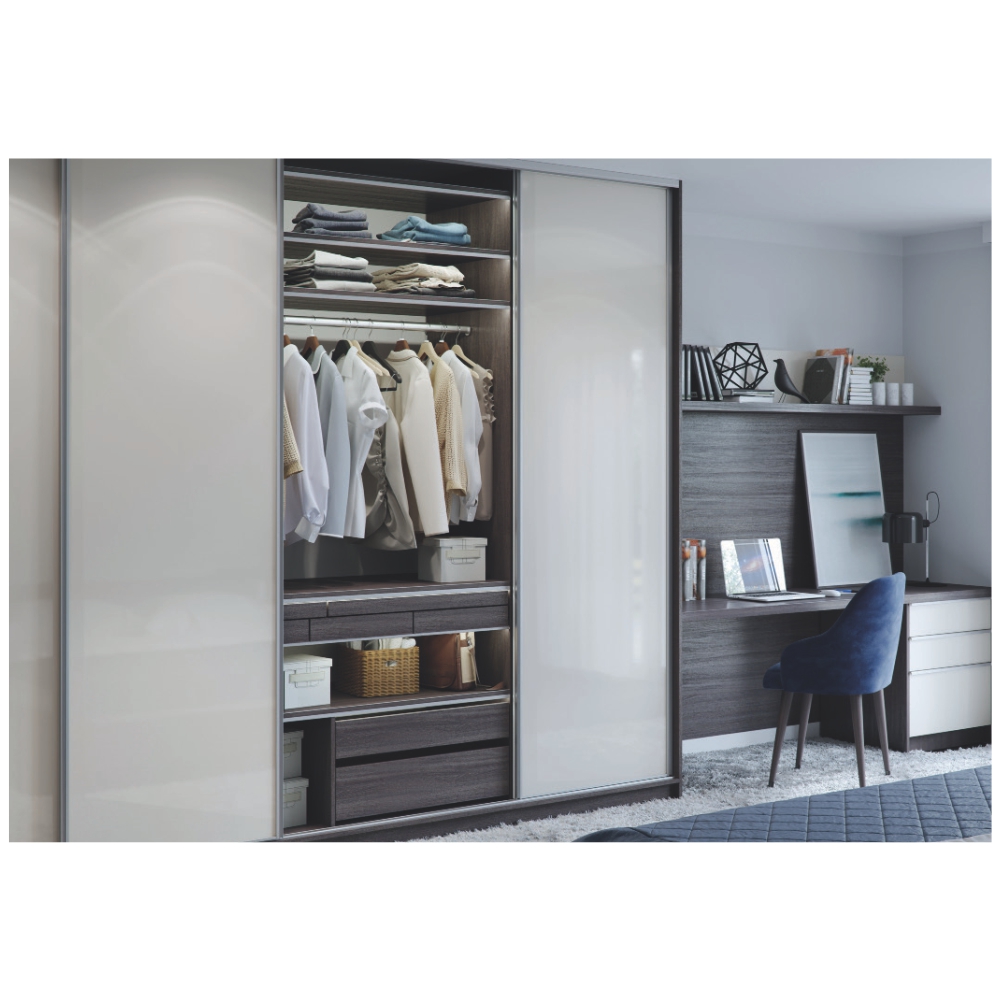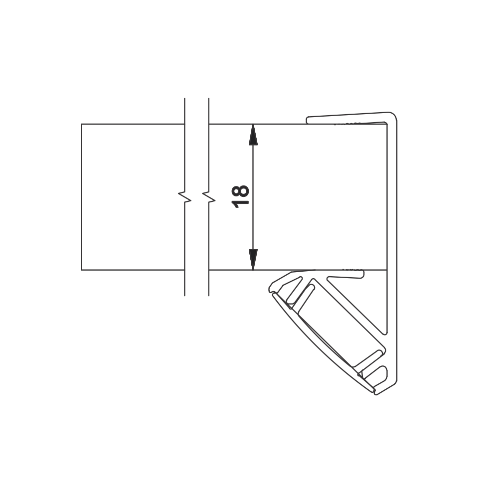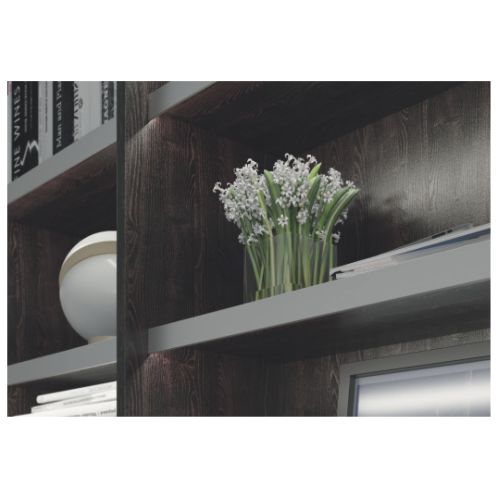 Jednostrani LED GLAX ugaoni profil pokriva kant police i osvetljava prostor unutar korpusa.