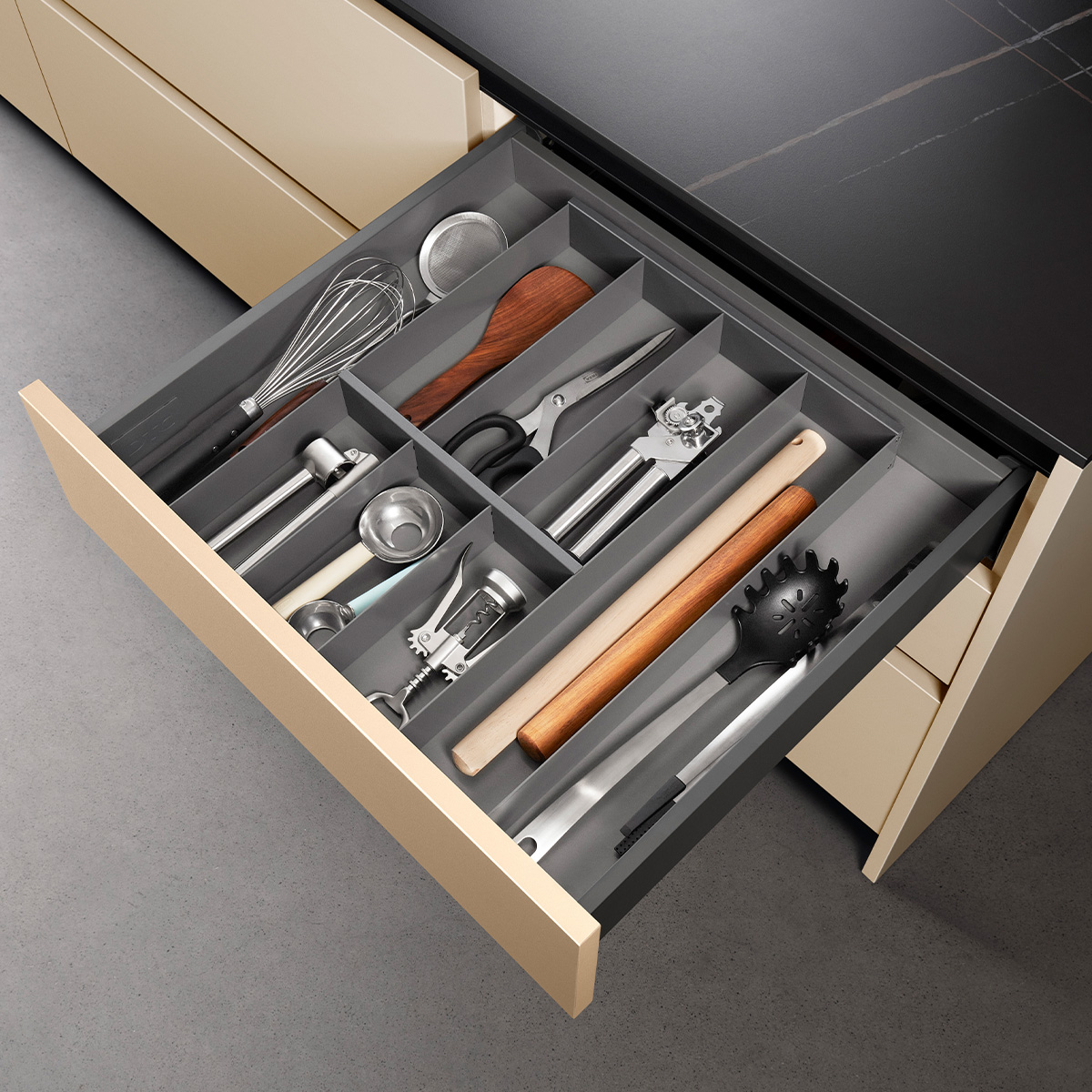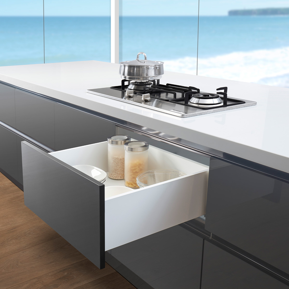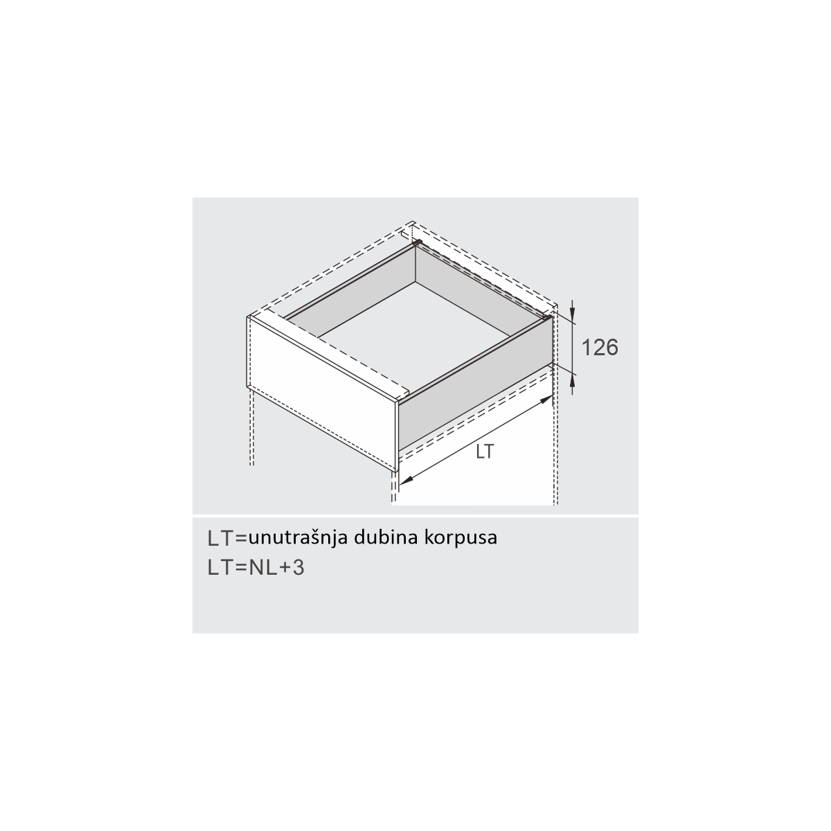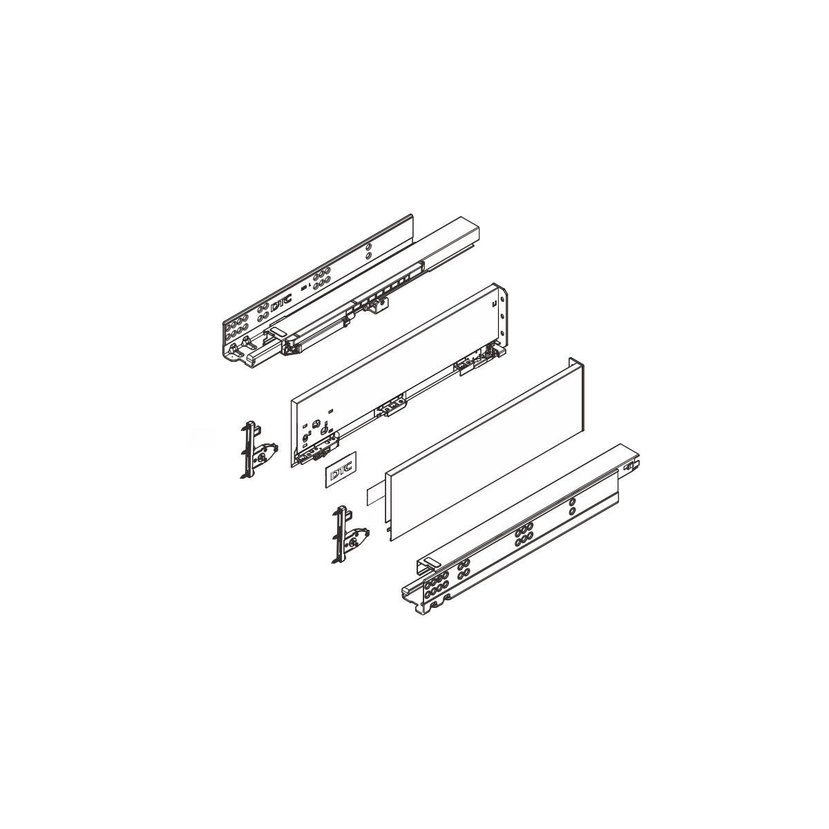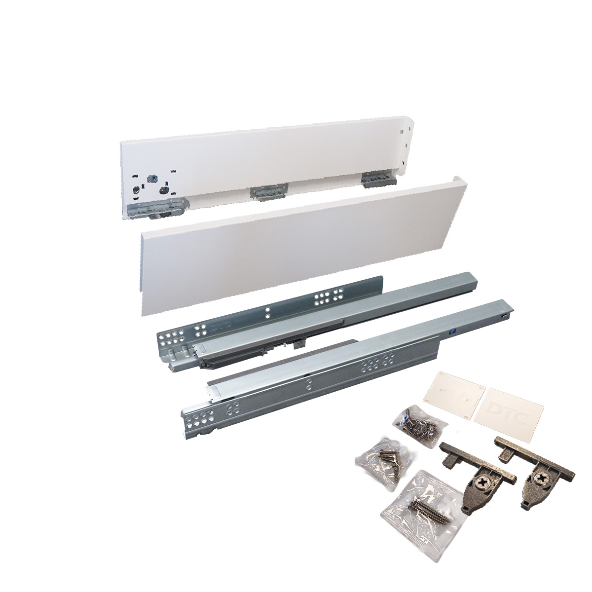 Set se sastoji od skrivenih klizača sa integrisanim usporivačima 500mm dužine, metalnim stranicama visine 126mm i svim pratećim elementima za montažu iste.