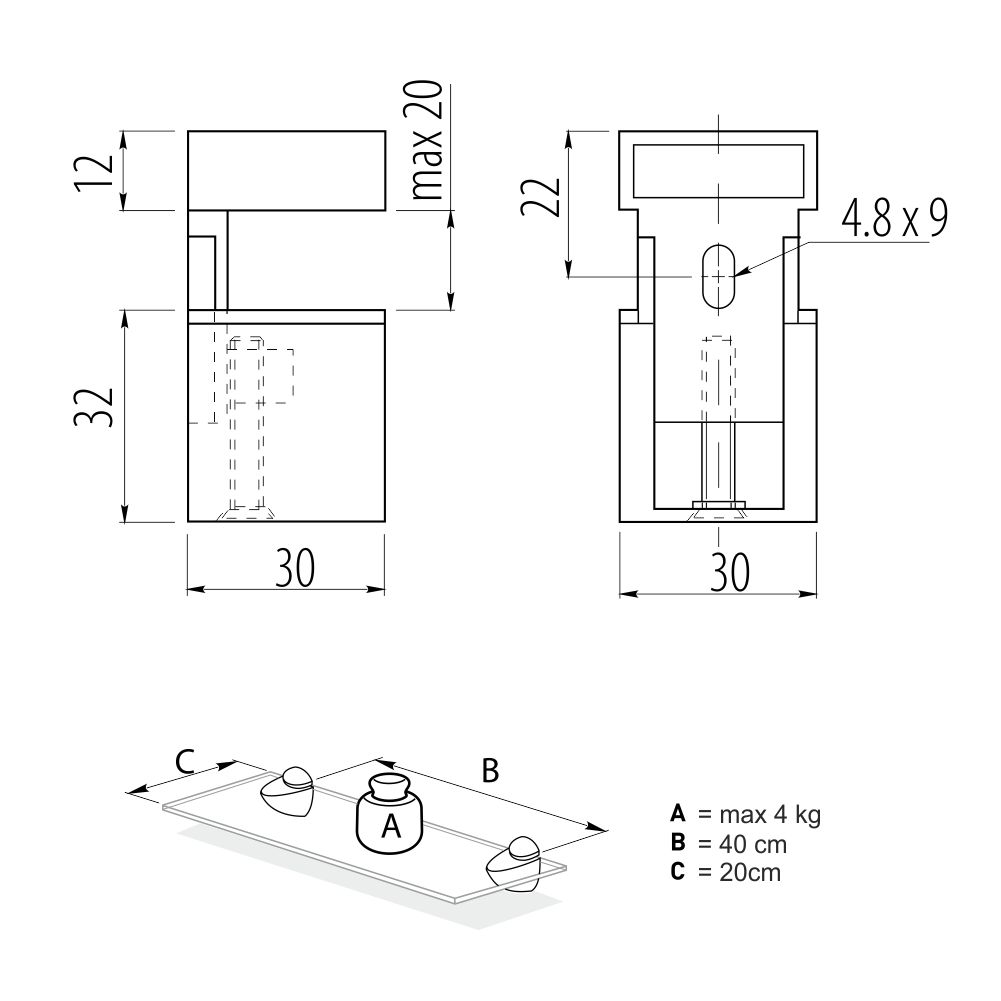 Višenamenski nosač polica koji se montira na zid, namenjen je za drvene i za staklene police maksimalne debljine do 20mm.