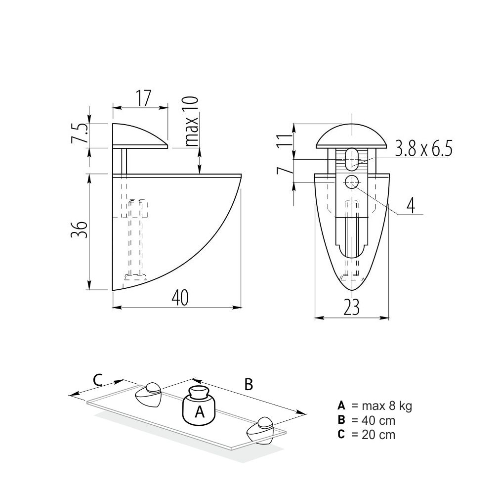 Višenamenski nosač polica koji se montira na zid, namenjen je za drvene i za staklene police maksimalne debljine do 20mm.