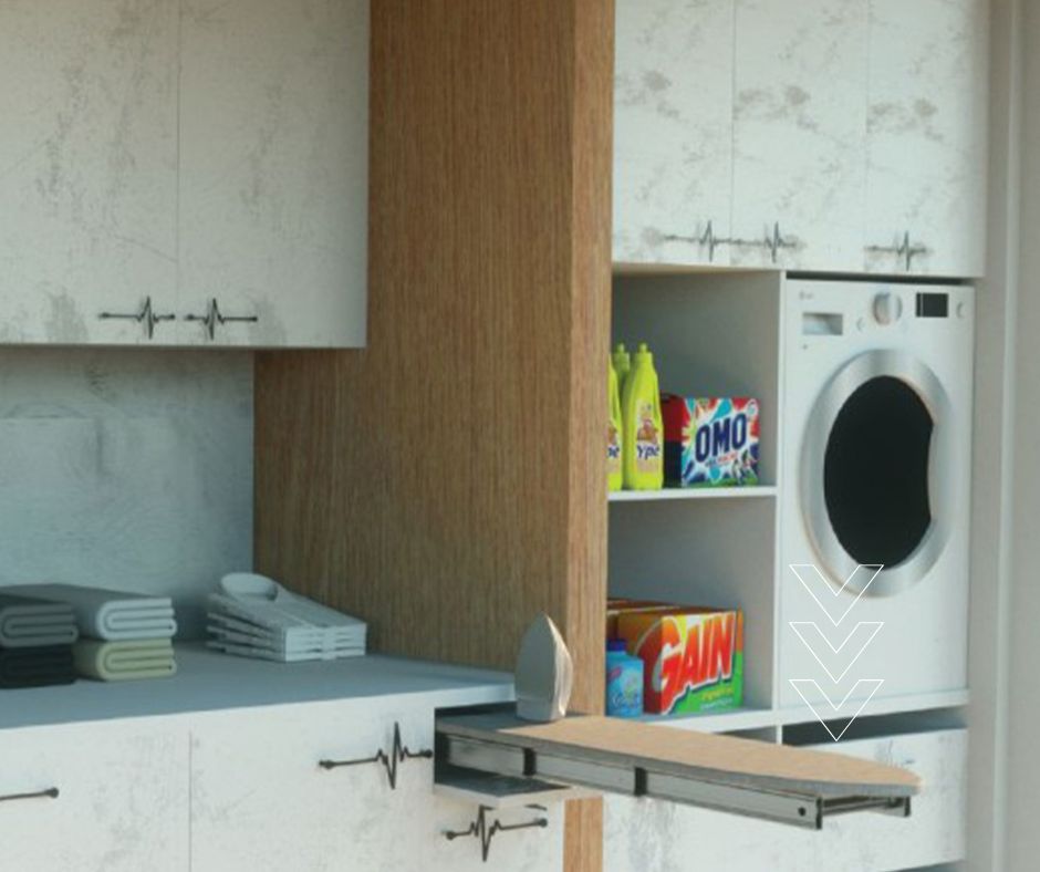 Ergonomski dizajn. Ugradna daska za peglanje se može podesiti na željenu visinu što znatno olakšava peglanje i sprečava bol u leđima.